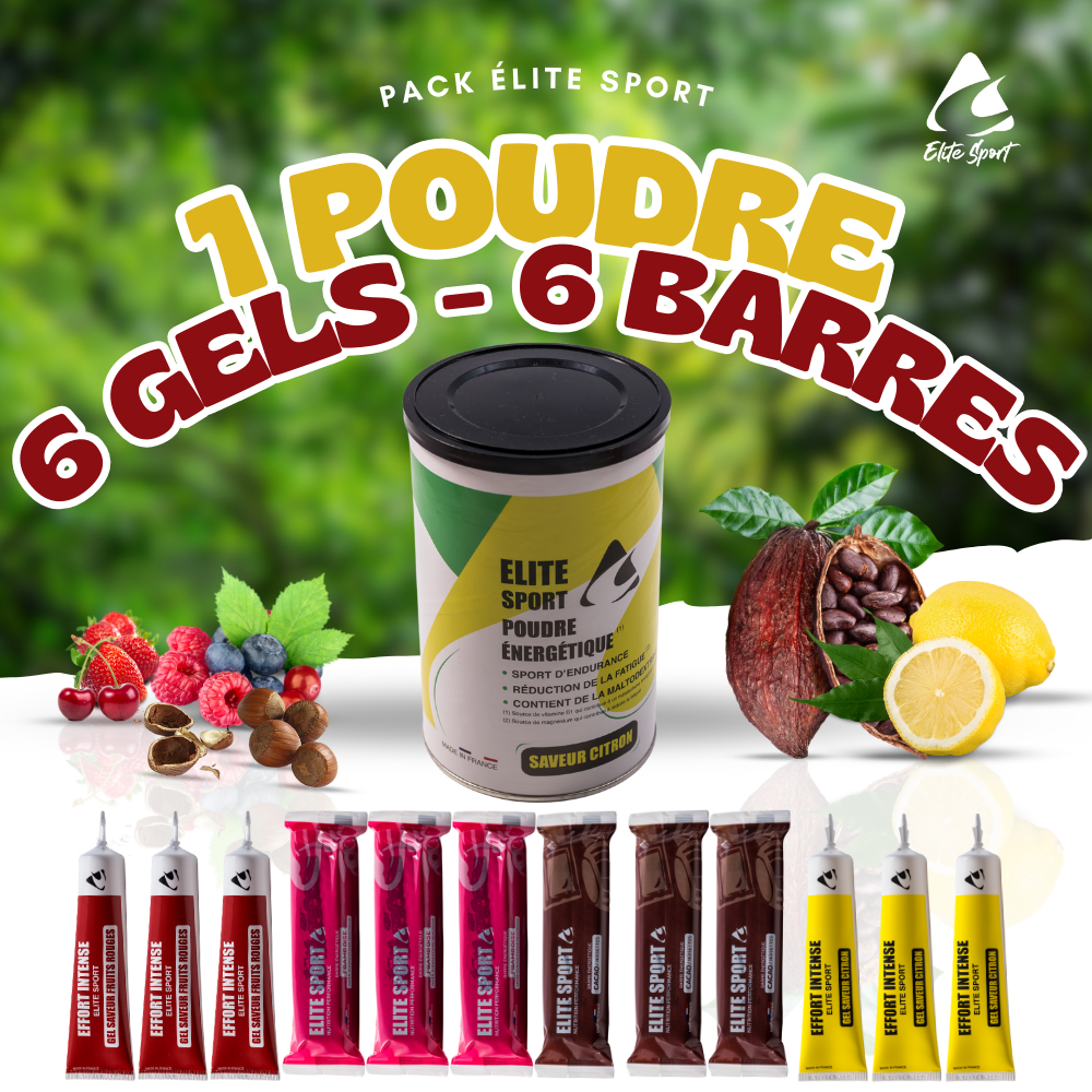 Boostez vos performances avec le Pack Elite Sport, la solution conçue pour vous accompagner à chaque étape et vous permettre de repousser vos limites. Composé d'une poudre hydratante, de gels énergétiques et de barres naturelles, ce pack complet vous offre un apport rapide en énergie, une hydratation optimale et une récupération efficace.